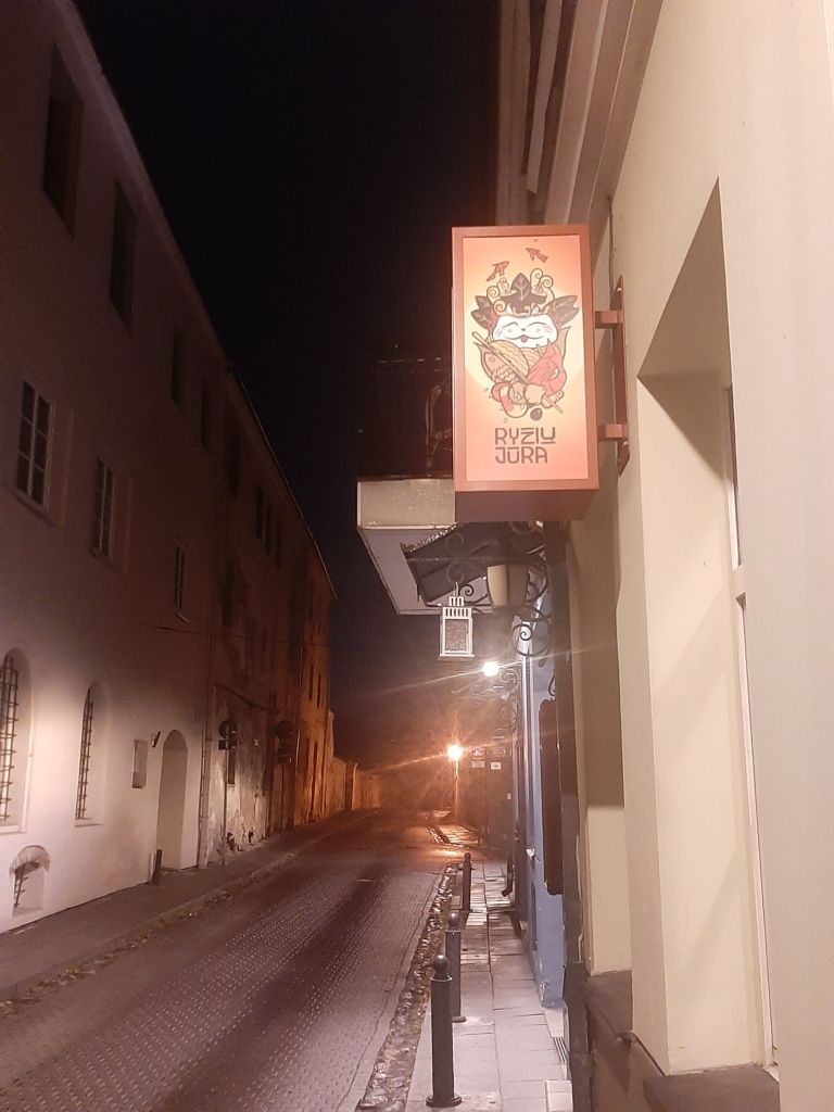 Бывалый „прибалт“ Гершом показал неплохую блинную на проспекте Гедиминаса. Я-то не люблю блинов, но — картофельные драники с лососиной, да ещё и с бельгийским вишнёвым пивом…хм! Весьма впечатляет.