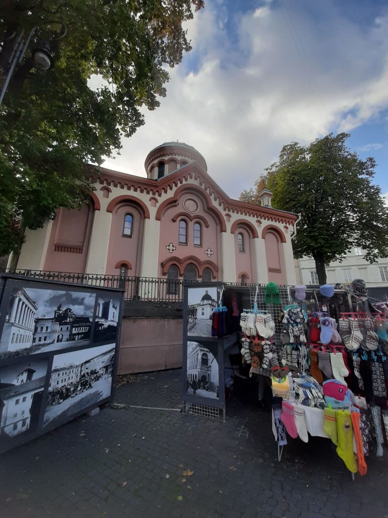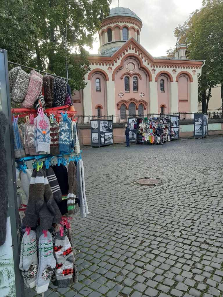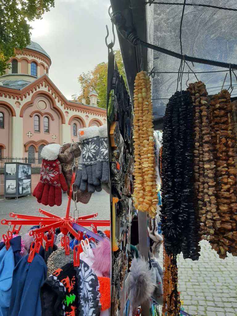 У Пятницкой церкви XIV века ряд щитов с чёрно-белыми старинными видами города и этой же церкви, и сходящихся к ней улиц. Оживлённо было: люди, брички, телеги… Теперь тут несколько киосков с развешанным товаром для туристов: вязаные варежки, и нити разноцветного янтаря.