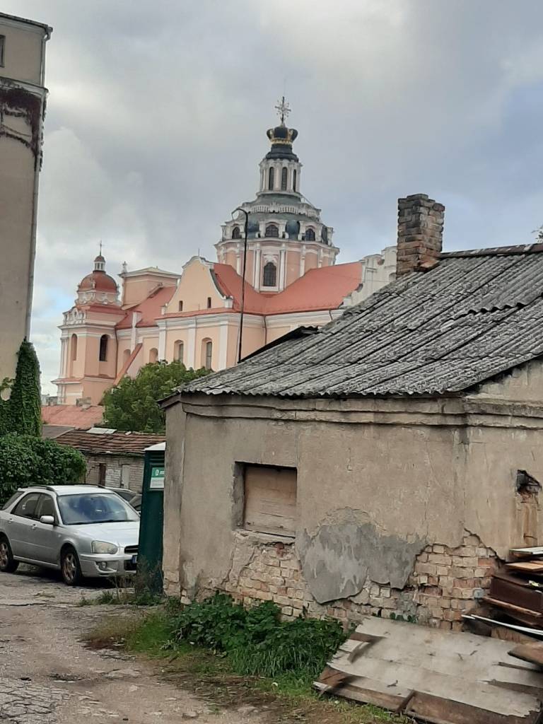 От Бастиона по тропке сквозь Миссионерский сад — и вот он, весь Вильнюс, вид сверху: Это зелень и черепица, церкви, башни, купола. Их много, и хочется рассматривать долго. Попутно меня снова затягивает в арку дворика, где, зажатый между жилыми домами и сароюшками, тоже явно столетними, странный ничейный низенький домик, с трубой — кто же жил на этих пятнацати метрах, сторож? Истопник? Домик заколочен, но он мне интересен. С кирпичного забора открывается наилучший вид на Вильнюс. Проходящие случайные жильцы вежливо не обращают внимания на дикого туриста.