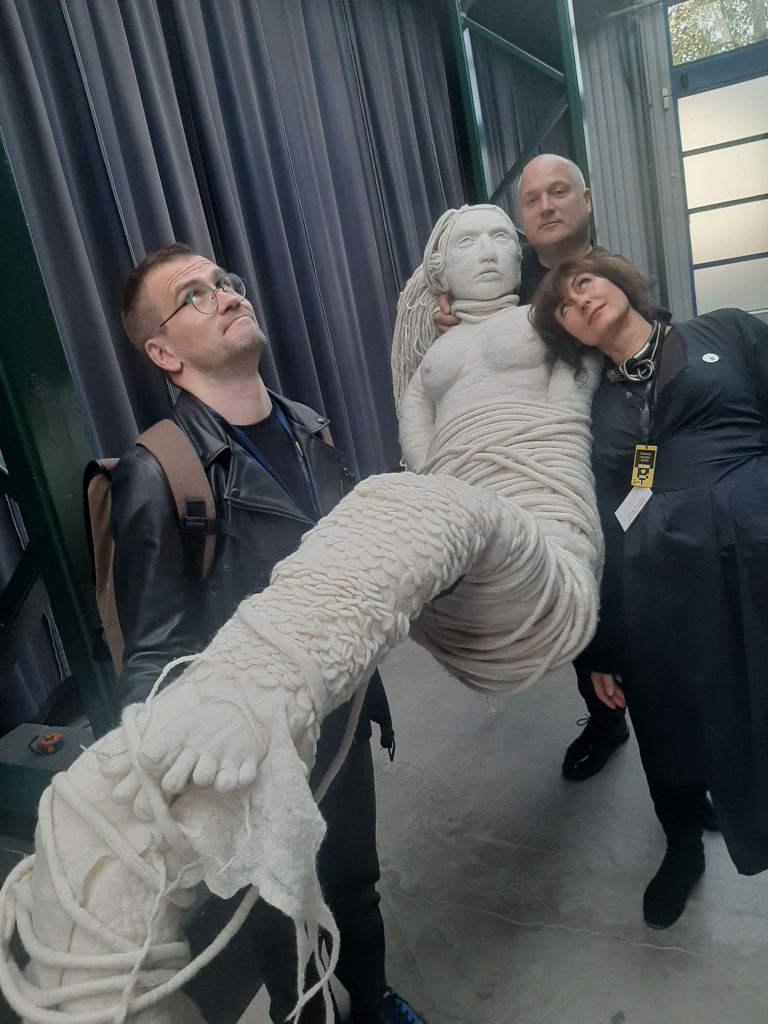 Эгле Ганда Богданиене, глава Союза художников Литвы, — несёт с помощниками фигуру русалочки из белого войлока. Она опутана верёвками, безжизненная, выброшенная морем на берег.