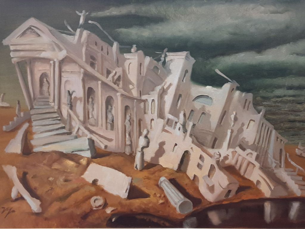 Тревожный колорит — болезненно-розовые руины и хищно-зелёное небо — перебрасывают мостик к классикам сюрреализма с их зачарованными фигурами, обживающими нежилые пространства.