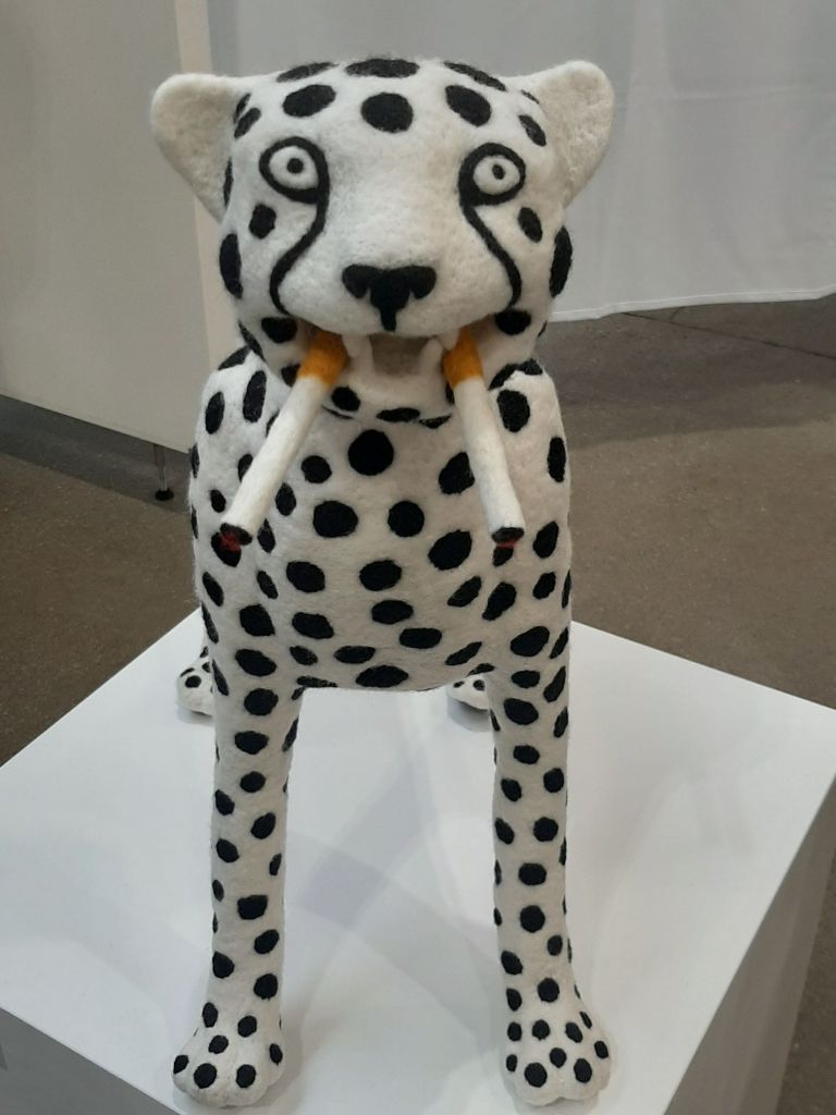 Скульптура пугающе реалистична. Публика боязливо заглядывает ей в раскрытые войлочные глаза.
