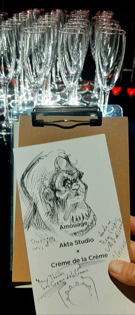 Центр притяжения „випов“– спонсорская VIP longe Créme de la Créme: встречают с кофе и шампанским. В полумраке салона, пропитанном восточными ароматами — бергамот, сандаловое дерево, шафран, папирус, можжевельник и мирра… Тут презентация нового парфюма. Рассказывают родословную этого изыска, разносят шампанское.
