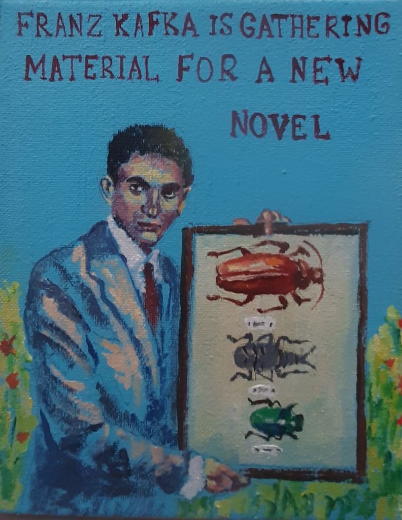 — Франц Кафка собирает в поле жуков в коллекционную витрину. Подпись: „Материал для нового рассказа“.