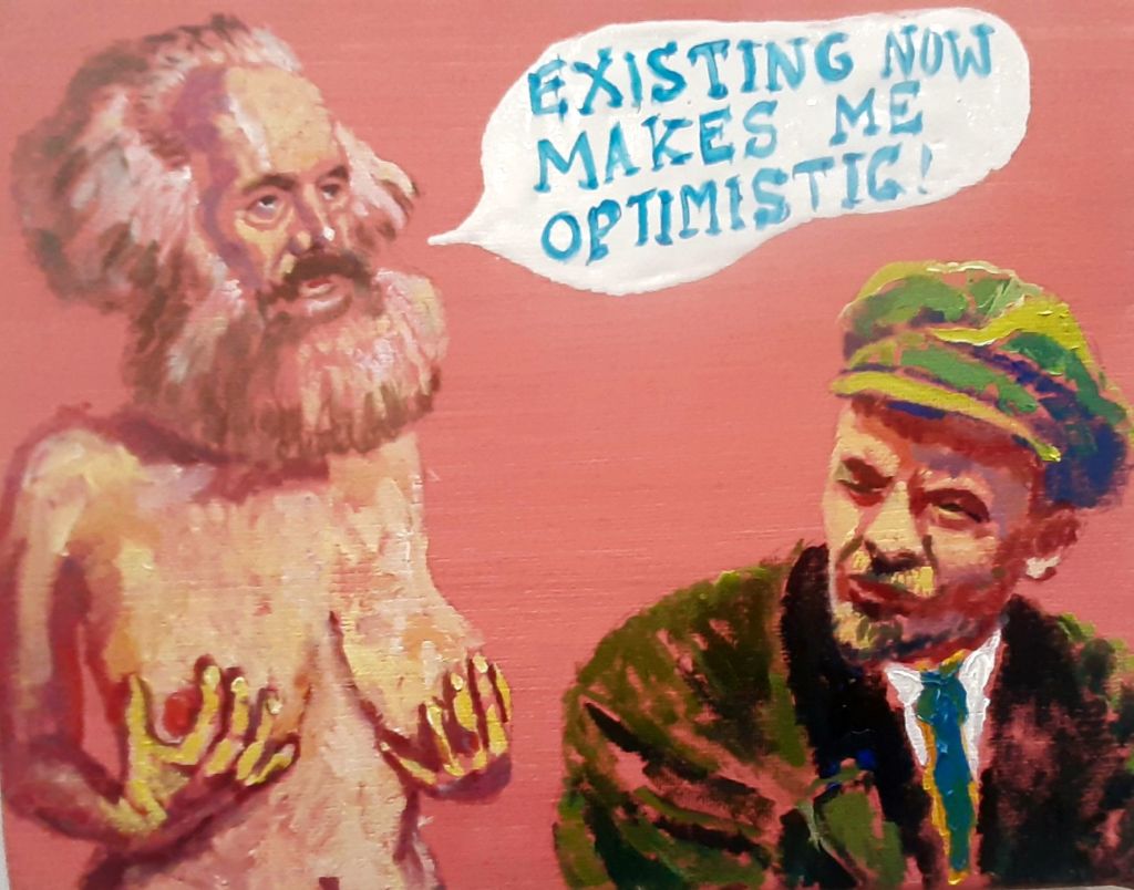— Карл Маркс представляет Ленину свой новый бюст: „Нынешнее состояние вселяет в меня оптимизм“. — Ленин оценивающе щурится и причмокивает губами.
