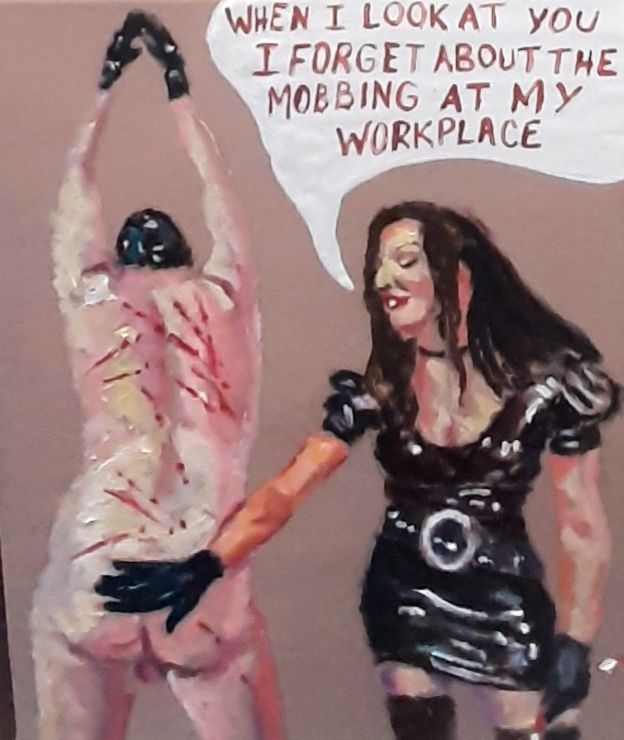 — Домина с хлыстом сообщает счастливому клиенту: “ При взгляде на тебя я забываю про моббинг на рабочем месте“.