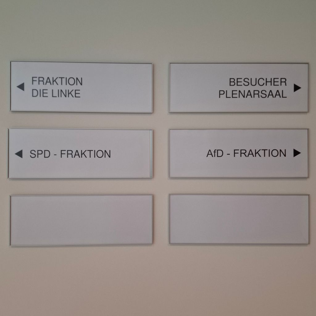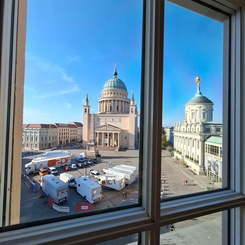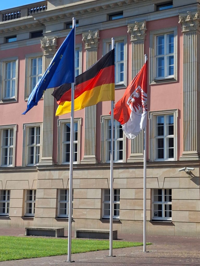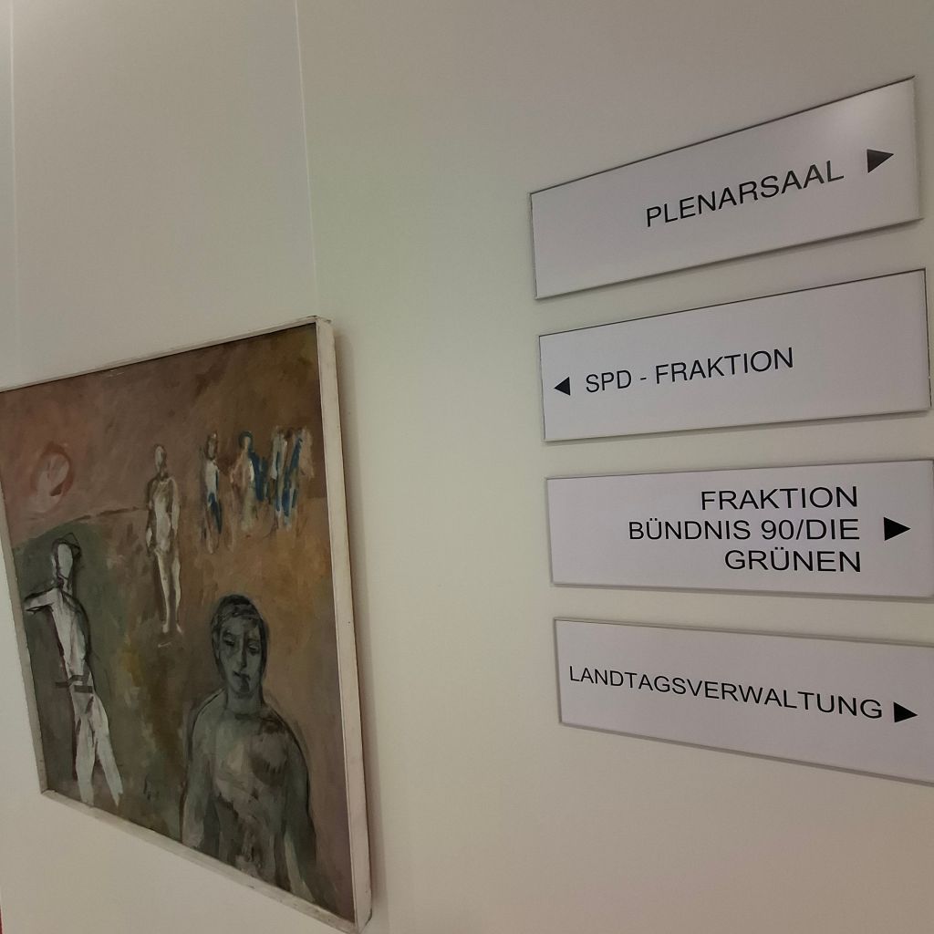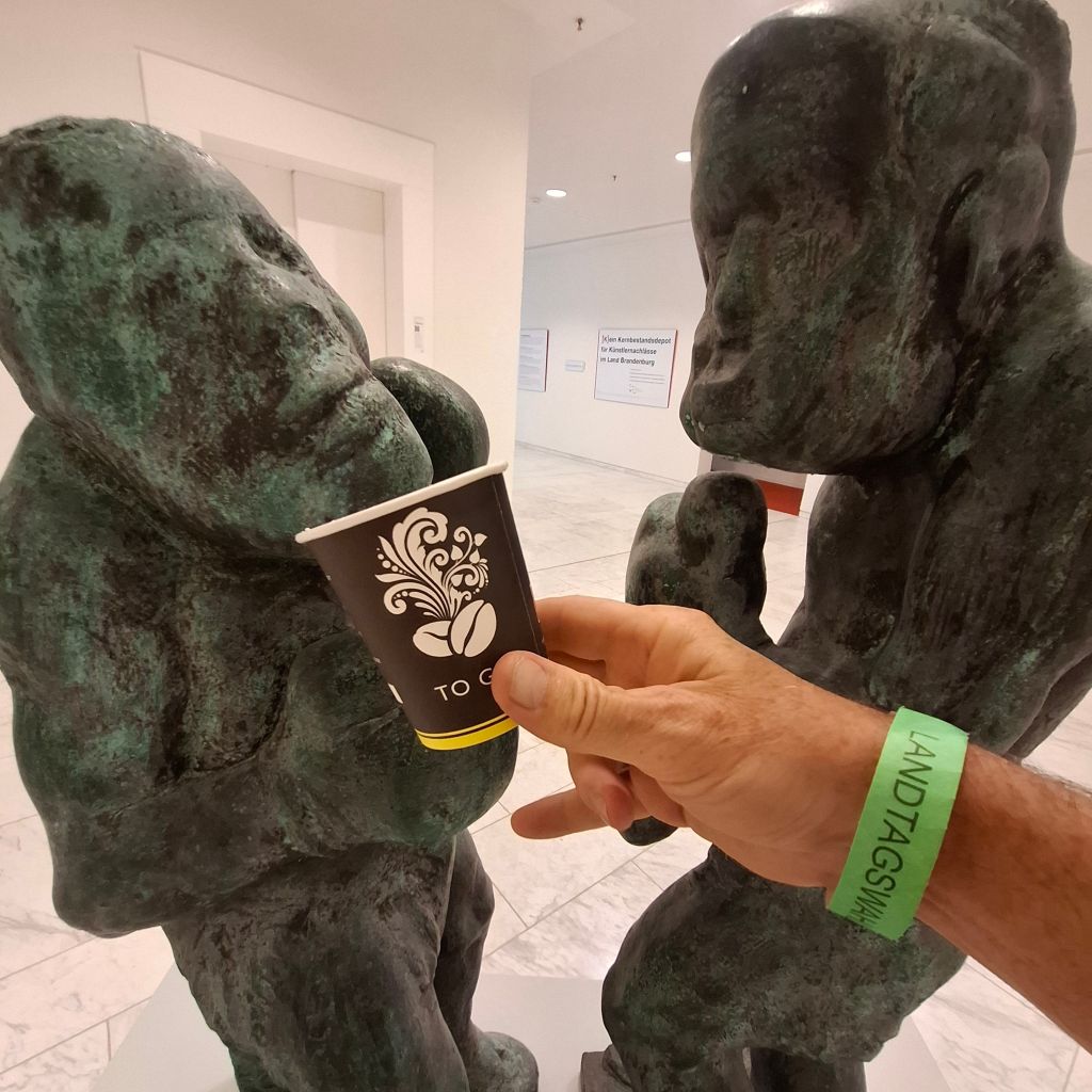 „Кулачные бои“ дискуссий в выборе нового правительства земли Бранденбург в режиме паузыОсновных партий здесь достаточно, чтоб понять разброс и разрыв мнений участников процесса выборов…и кое-какие таблички ещё пусты. Грядущие политические споры наверное вскоре приведут к возникновении новых партий-отдушин, партий-громоотводов и платформ для новых высказываний, острых и парадоксальных. Ну так это и есть демократия!Око голубого экрана. Передвижная студия второго канала в здании парламента Kaffee-Pause. Глоток кофе, отрезвляющий или возбуждающий, или успокоительный, или… да мало ли разных реакций, — их много, как и мнений всех обо всём, особенно в политике Уголок-выставка в фойе парламента-ландтага, посвящённая коренному славянскому меньшинству Бранденбурга — лужицким сорбам (сербам). В парламенте есть и специальный департамент по делам лужицких сорбов.Выборы в парламент– важнейшая новостная тема телевидения. Грузовики тлекомпаний с аппаратурой прямой трансляции Вид на здание парламента из окна музея Барберини (Museum Barberini)